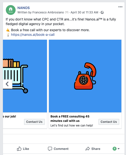This first example is a carousel suitable for SAAS startups or digital services looking for customers. Our goal is to take the user to a landing page where it is possible to book a strategy call with one of our consultants.