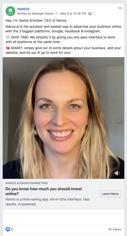 The description provides further explanations about Nanos and some features of the platform. In this case, our goal is to increase brand awareness and bring users to the nanos.ai site to discover more about us and the product.
